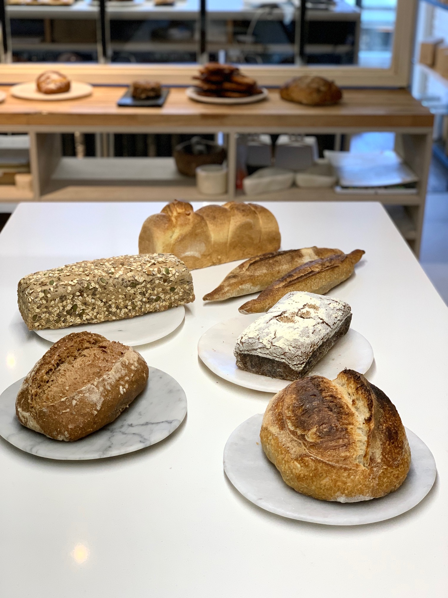 Y sus panes: de molde de brioche, barras rústicas, pan de molde con salvado y harina blanca, ciento por ciento integral con semillas, ciento por ciento de centeno cubierto con harina de arroz y el blanco de masa madre.